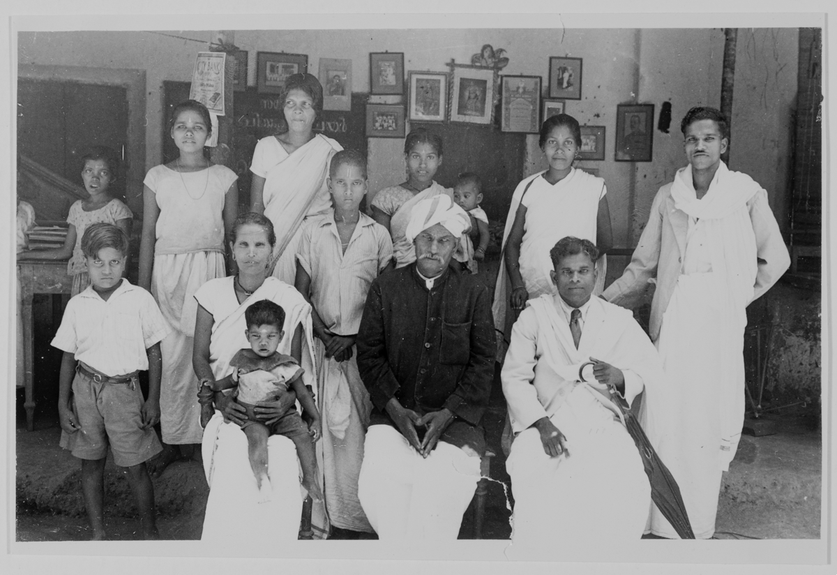 (Background) A Kirriyam Nair joint family poses in front of their tharavad. Photograph by L. K. Ananthakrishna Iyer. c. 1901-1908. MAA P.167112.
