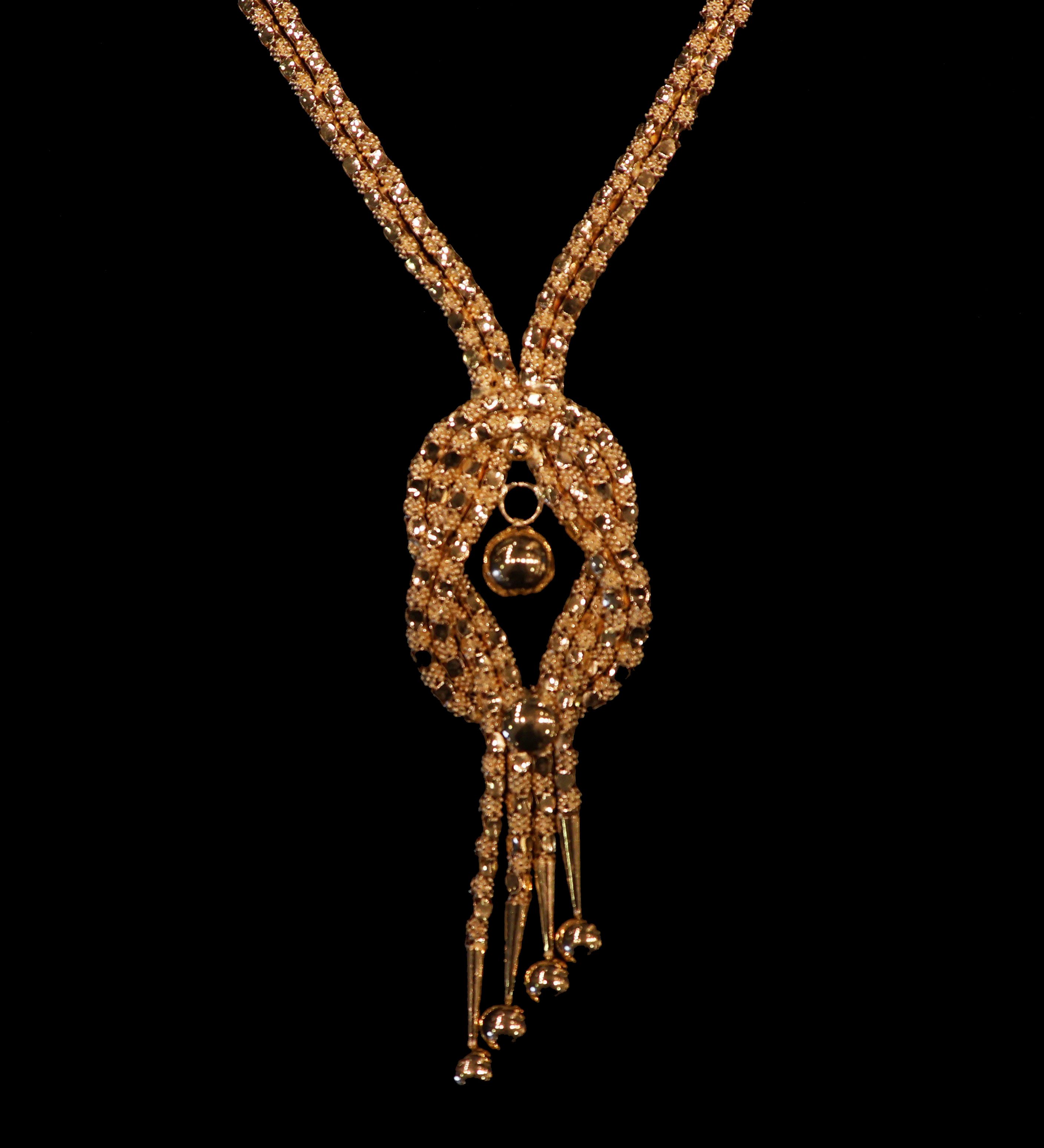 A modern kuzhalmothiram. The necklace has become lighter in weight in its contemporary form, but still retains the tubular drum like kuzhal shape which is completed with a pendant. It is no longer worn for tradition but for ornamental purposes. Photograph by Devaki Vadakepat Menon, at Thottan Jewellers in Thrissur. 2025