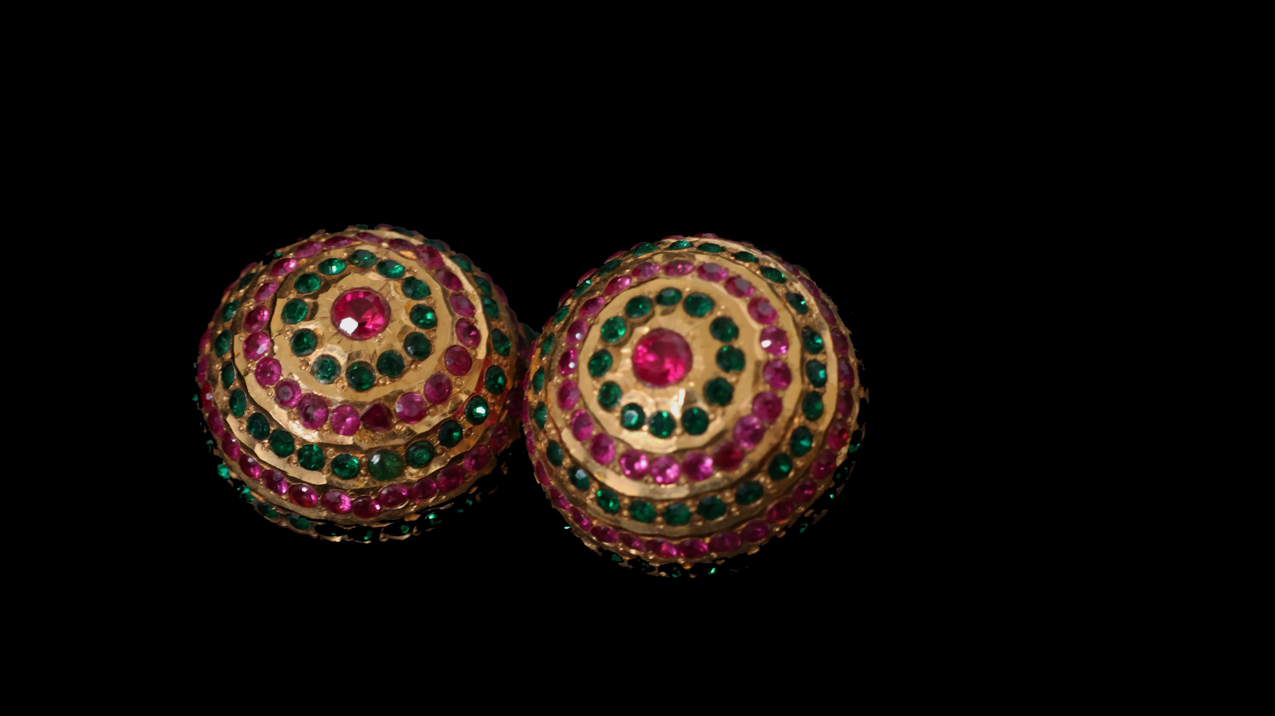 A form of the thoda earring fitted with rubies and emeralds. Owned and photographed by Devaki Vadakepat Menon. 2025.