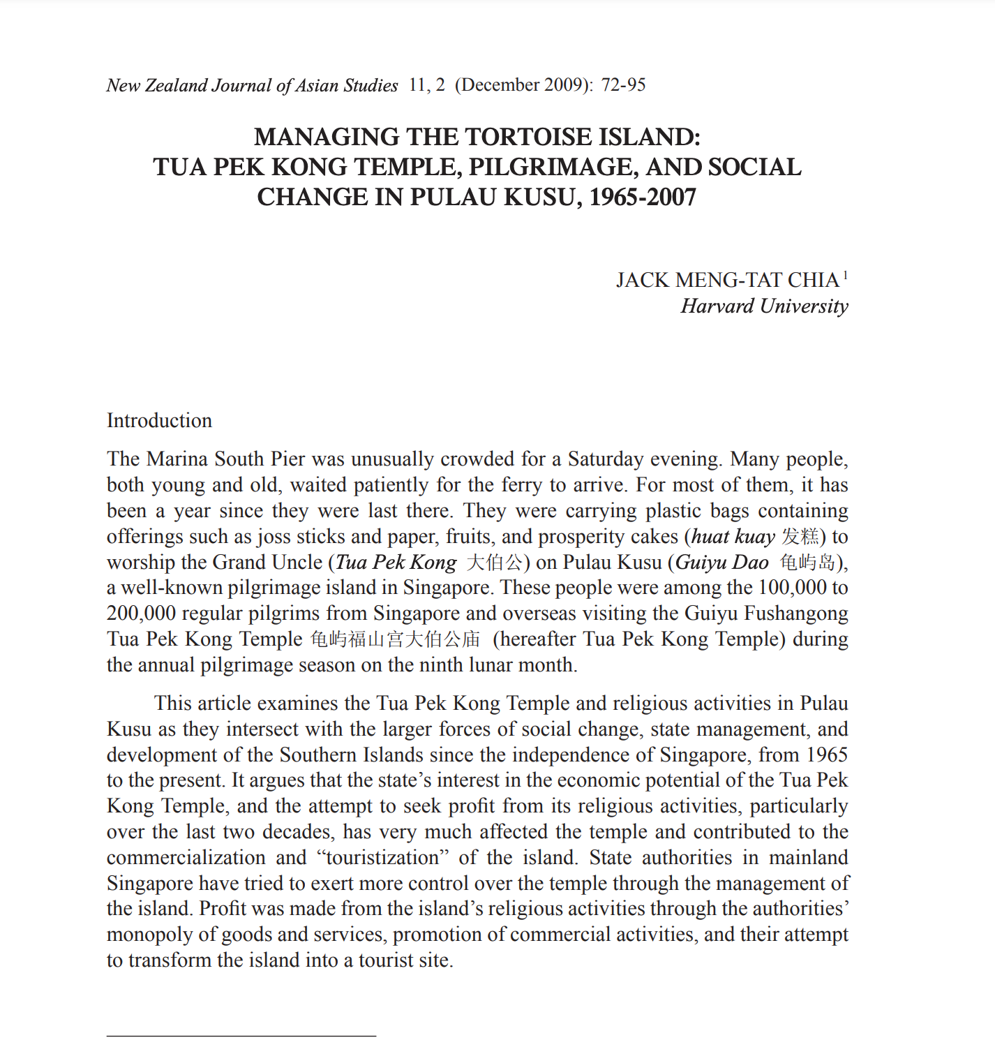 Since the colonial period, the Kusu Island pilgrimage has been celebrated as a symbol of Singaporean racial and religious harmony, with pilgrims honouring both Chinese and Malay places of worship. After Singapore’s formal independence in 1965, developing Kusu was seen as important to nation-building and national economic development. In 1974, the postcolonial government announced plans for developing the Island, supporting land reclamation.