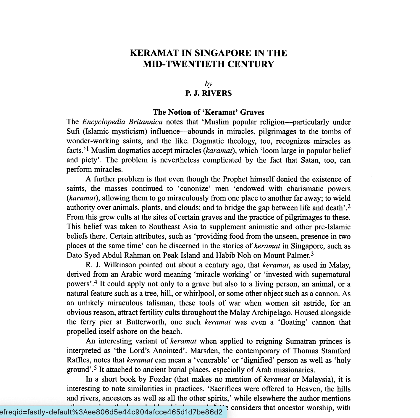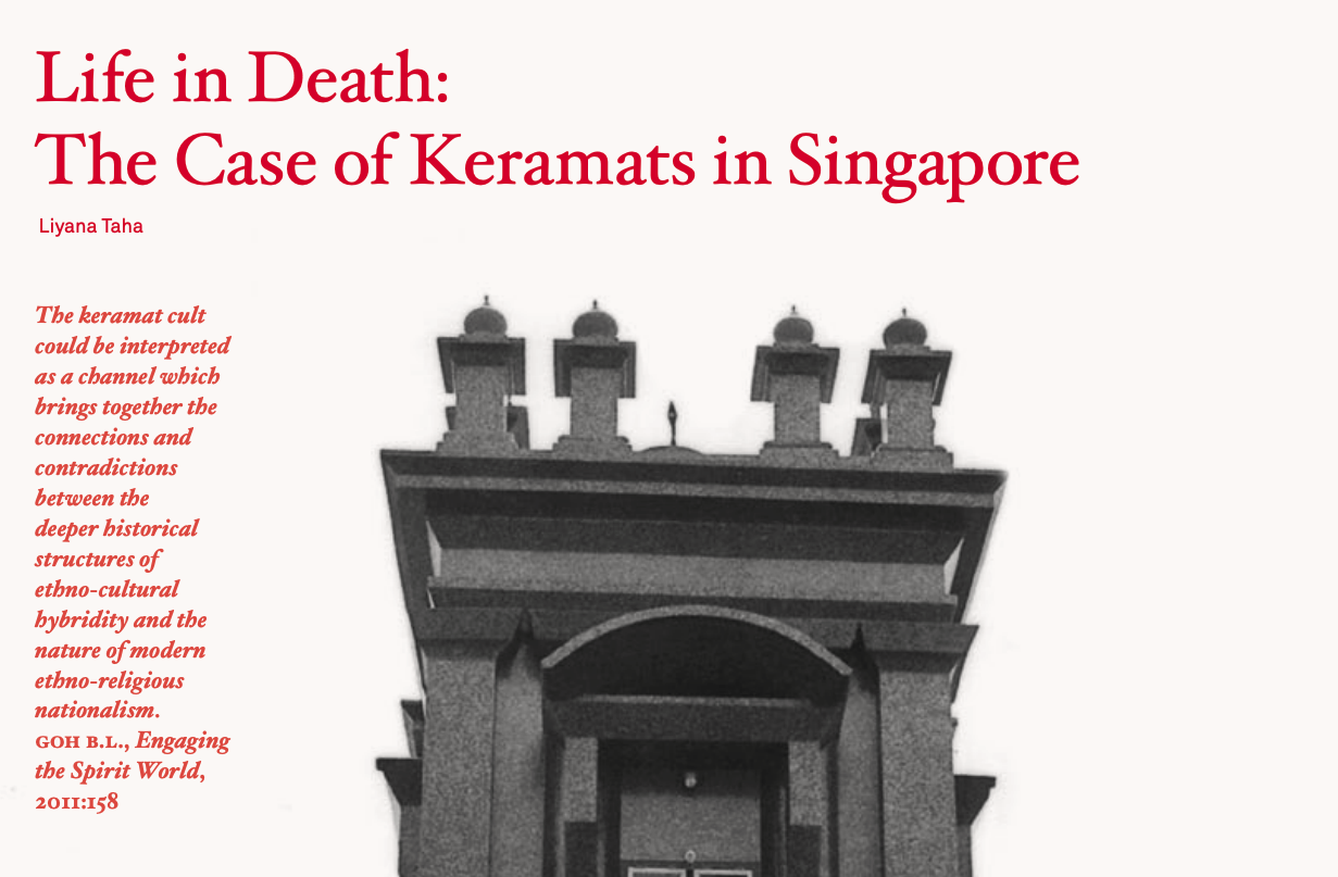 In Singapore and Malaysia, keramat are sacred shrines where people pay respects to saints or holy persons. Keramat worship is thought to have originated from pre-Islamic Malay animism and early Sufi Islam. It is believed that spirits are tied to particular natural landscapes and elements like trees and rocks.