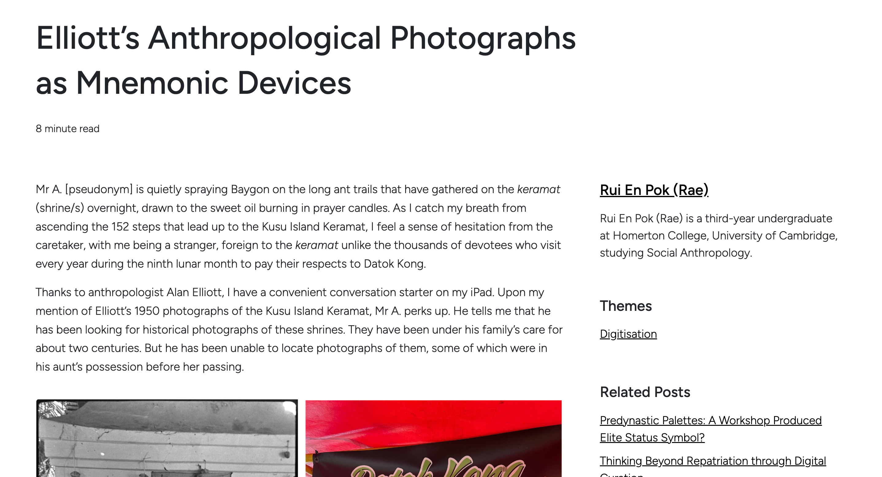 He was enthusiastic that displaying these photographs would encourage visitors to ask about the keramat’s history and stories. The display has since transformed the keramat into a space where the caretaker and devotees can share stories, filling in gaps in Elliott’s photographs and giving them new life. Displaying Elliott's photographs also emphasises the keramat’s strong historical value, supporting its restoration and preservation.