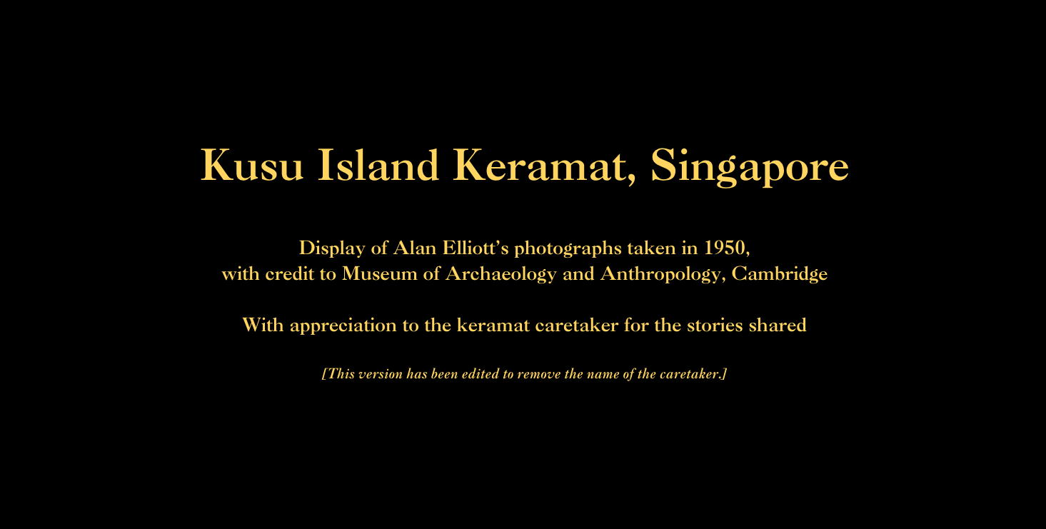 In the summer of 2023, I visited Kusu Island with a collection of photographs from MAA and befriended several devotees, including the caretakers of each place of worship: Mr K and Mr W (pseudonyms). They generously shared their time and stories with me, discussing changes to the Island that they have observed or heard from their parents and grandparents. Much of this exhibition’s content is derived from these conversations.