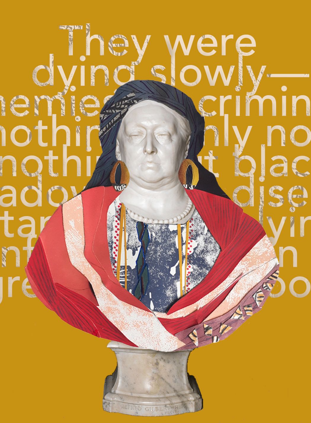 Carole Bouvier's digital collage is inspired by the Fitzwilliam Museum's bust of Queen Victoria. The collage dresses the Queen in patterns inspired by Nigerian fabrics in the collection of the Musee du Quai Branly-Jacques Chirac, Paris, and period photographs.