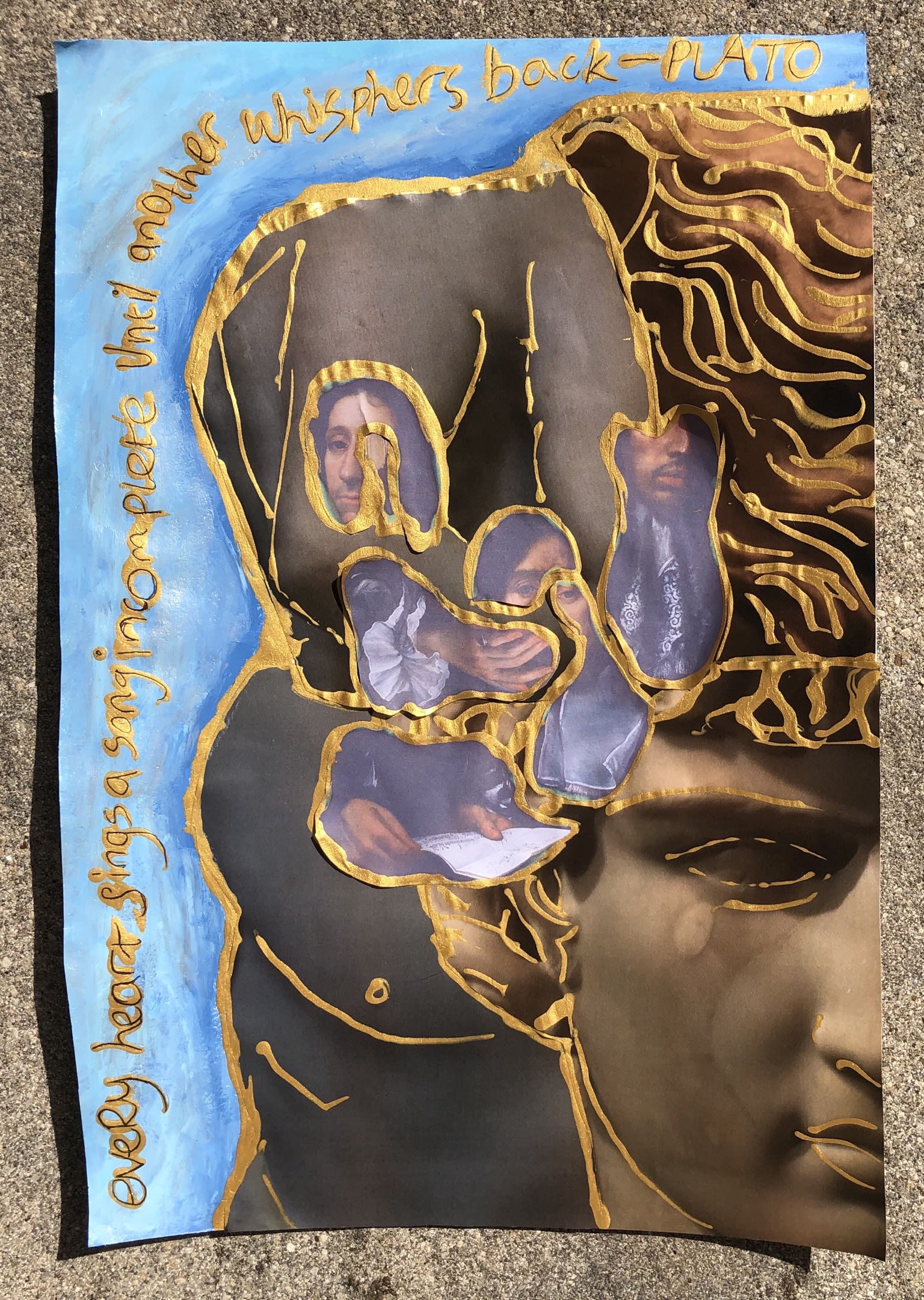 Lucian says, "The exploration of the piece is immediately obvious: the gold that edges the collage’s pieces, highlighting the observational beauty of the subjects (and thereby implying the desire of the artist) is staggeringly beautiful."