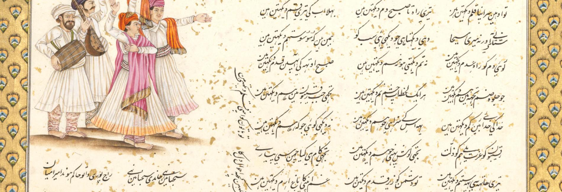 Image: Detail of page from the songbook of Sophia Elizabeth Plowden, with lyrics of Rekhtah ghazal by Asaf al-Dawlah, Nawab of Avadh. Punjabi tappah, ink, opaque watercolours, and gold on paper, Lucknow, India, 1787-88. © Fitzwilliam Museum Cambridge